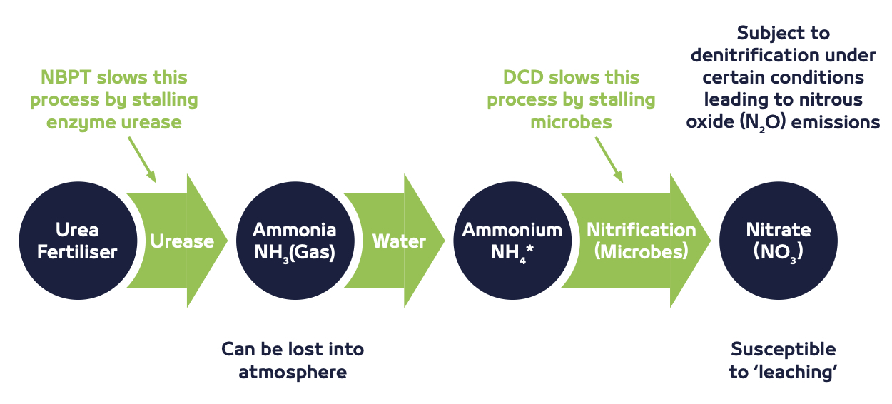 The active ingredient (NBPT) minimises urease enzyme activity which slows the conversion of urea to ammonia gas while (DCD) slows the conversion of ammonium to nitrate preventing loss of nitrogen via leaching or denitrification.